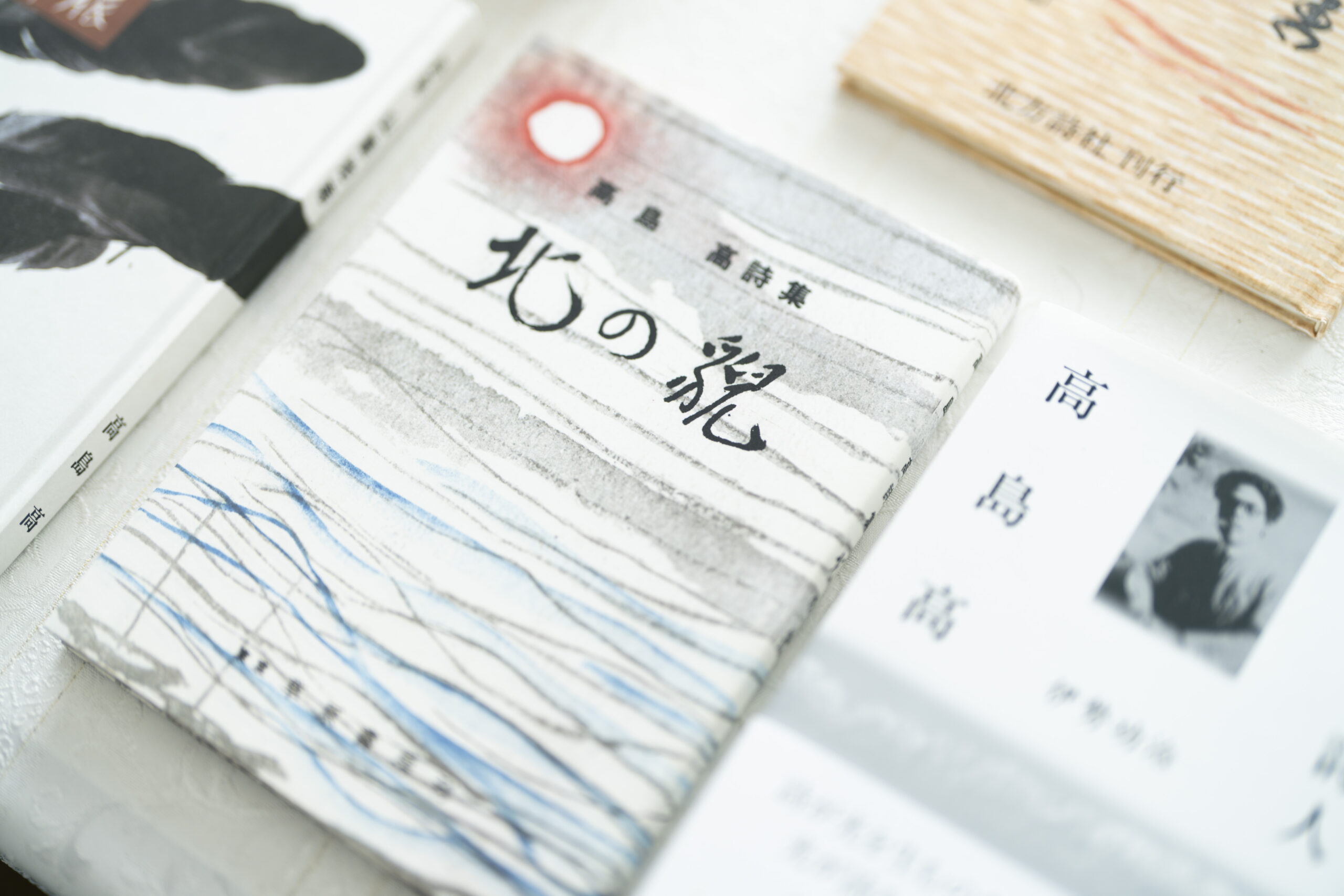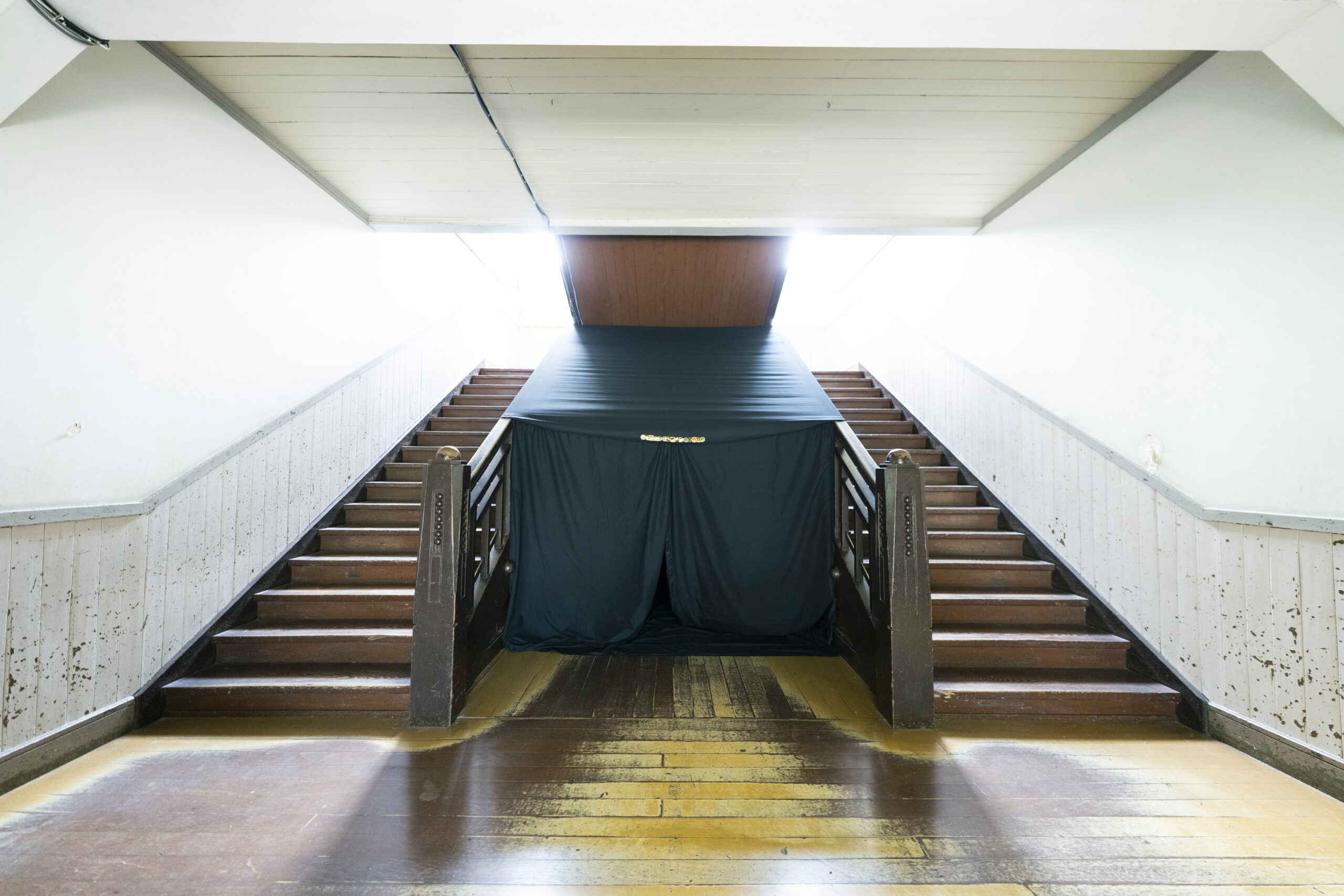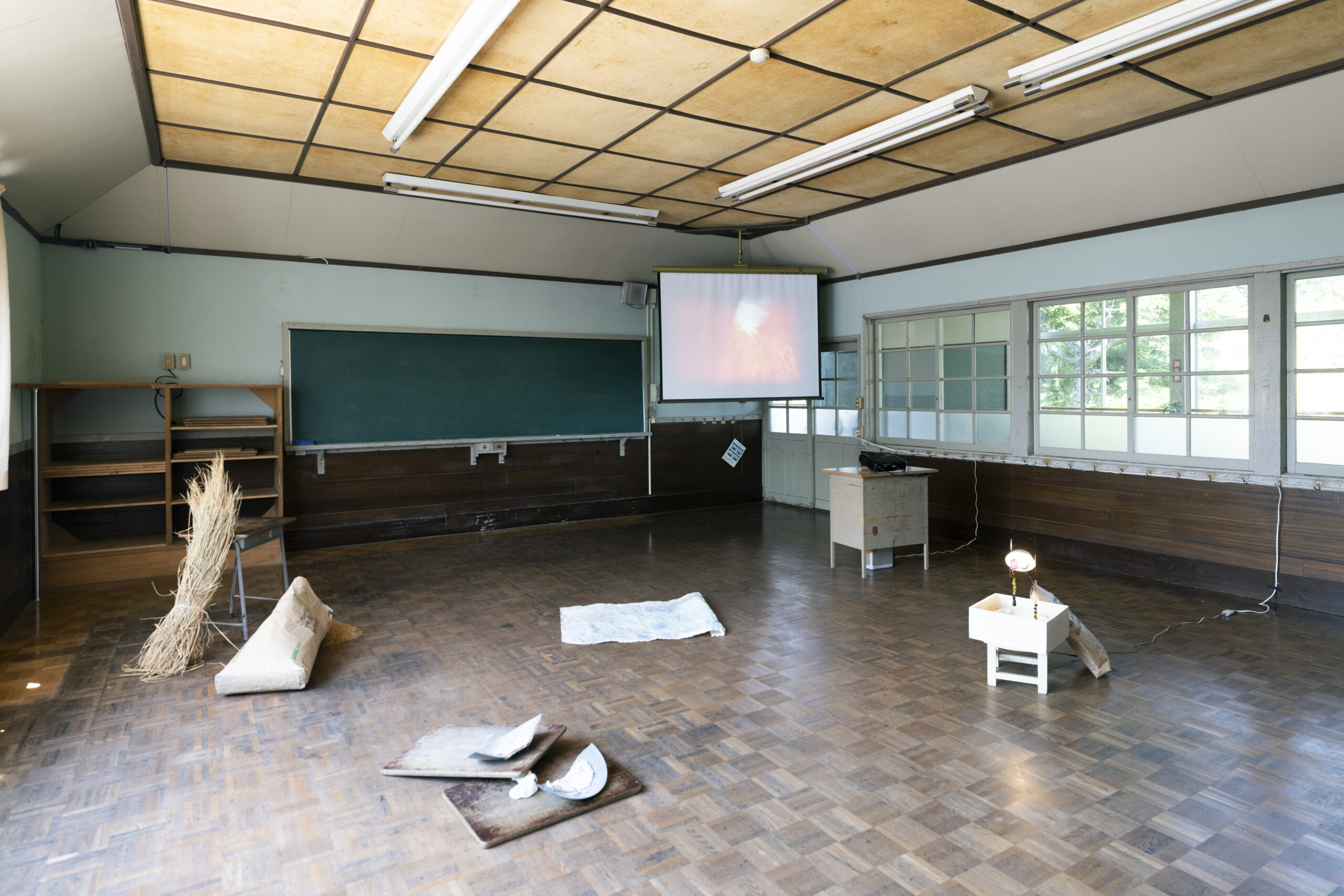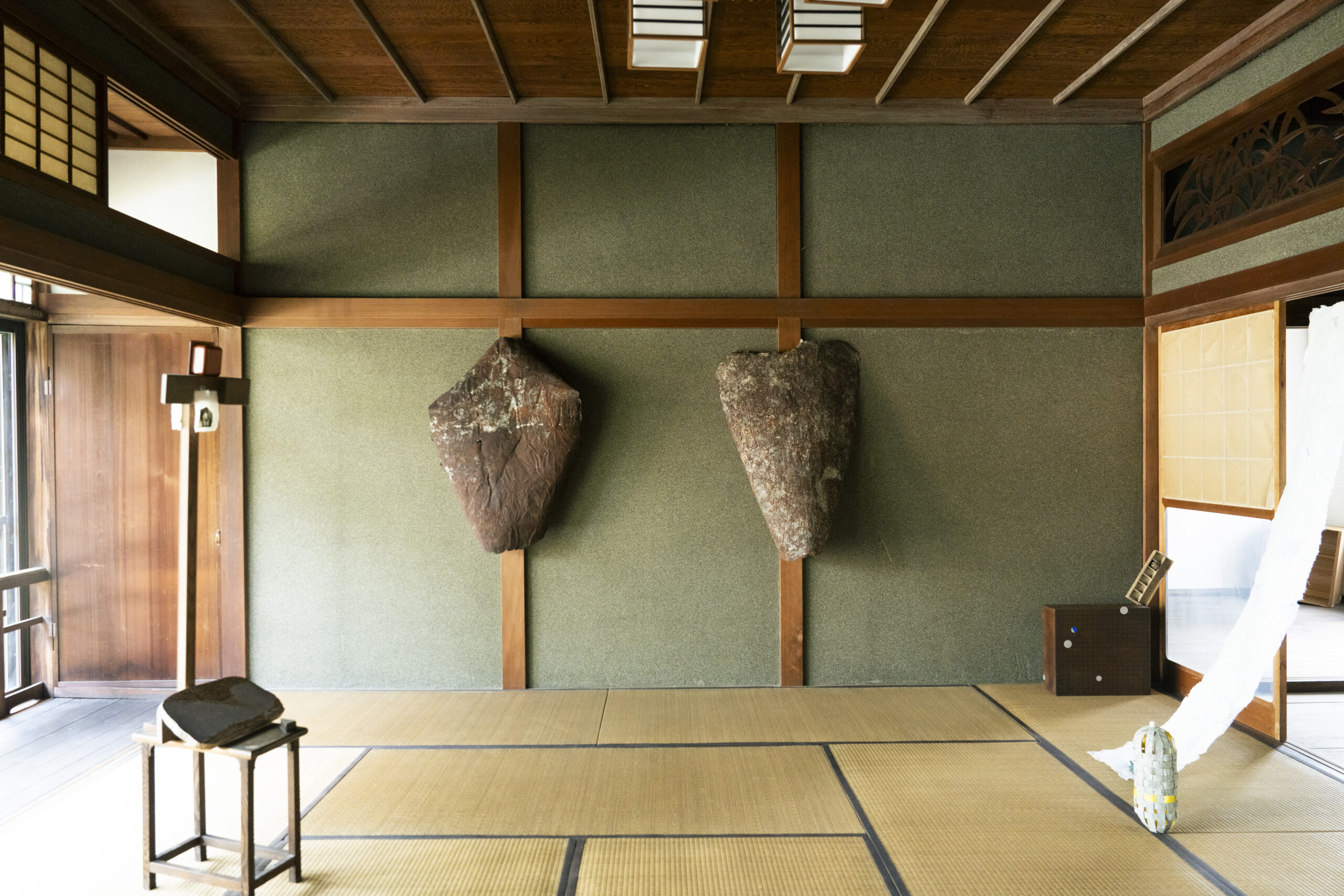 滑川に着いて、まずは歩きまわってみることから始めました。細い路地のはじまりの山吹色に掠れた小さな足跡マーク、スーパーへの近道にある回転するカラフルなフラワーの飾り、トタンや融雪装置から道路に滲み出ている錆、見たことのない模様の板ガラスの数々、透明な波板で囲われた寺院、空き地に並べられた大きなタライが生み出すリズム。家々の隙間から海や山が顔を出すたびに、遠くにあるはずの景色がふいに近づいてくるような気がしてなぜか嬉しくなりました。詩人・高島高は本展の会場である旧高嶋医院で生まれ、医師の傍ら詩作もおこなっていました。2 階にある広間は「望碧楼」、茶室は「不問庵」と名付けられ、各地の詩人・文人らと交流したり近所の子供達を遊ばせたりといつもにぎやかだったそうです。空間に点在している造形物には、五箇山和紙や海岸で採集してきた海水・流木・石、北日本新聞など富山各地で集めた素材を用いています。造形物と旧高嶋医院、そこに遺されたもので再構成することで、彼の詩に描かれた景色と私がみてきた滑川の景色が重なった新しい景色が立ち上がってくるのではないかと思います。