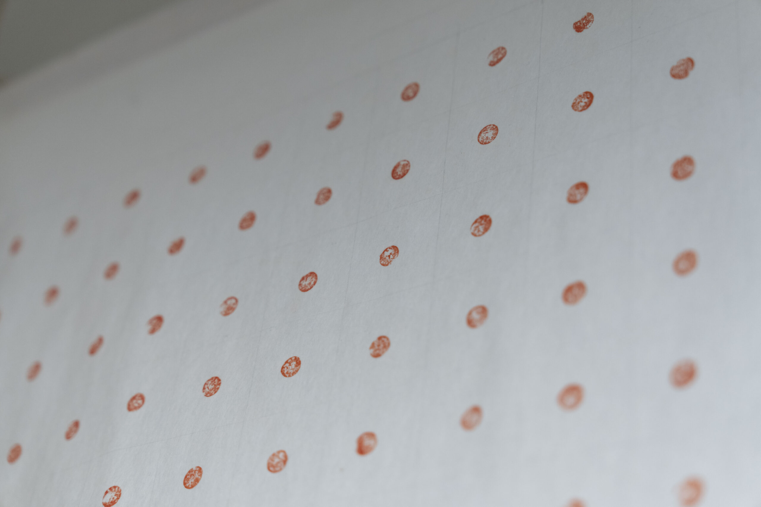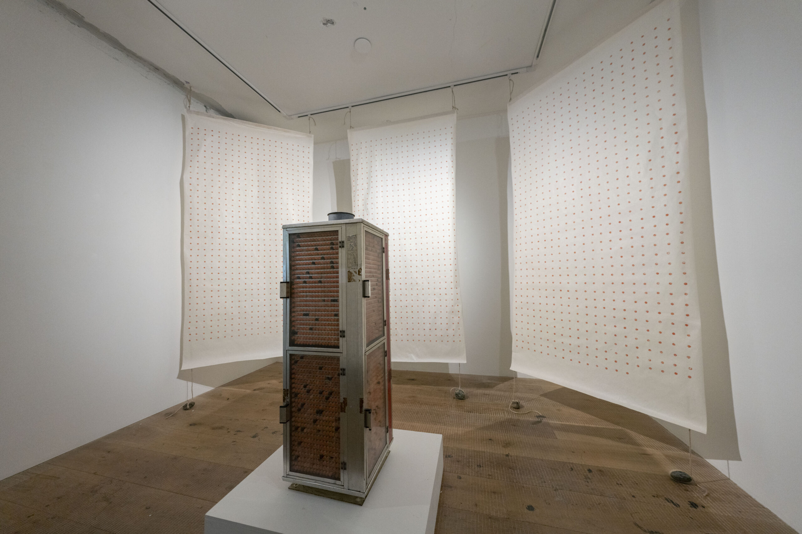 この作品は、使われなくなった印鑑棚との偶然の出会いから生まれた。そこには3000 枚の印鑑が収められていて、私は刻まれた名前を一つ一つ、《般若心経》を一遍唱えるあいだに、手作業で削り落としていった。